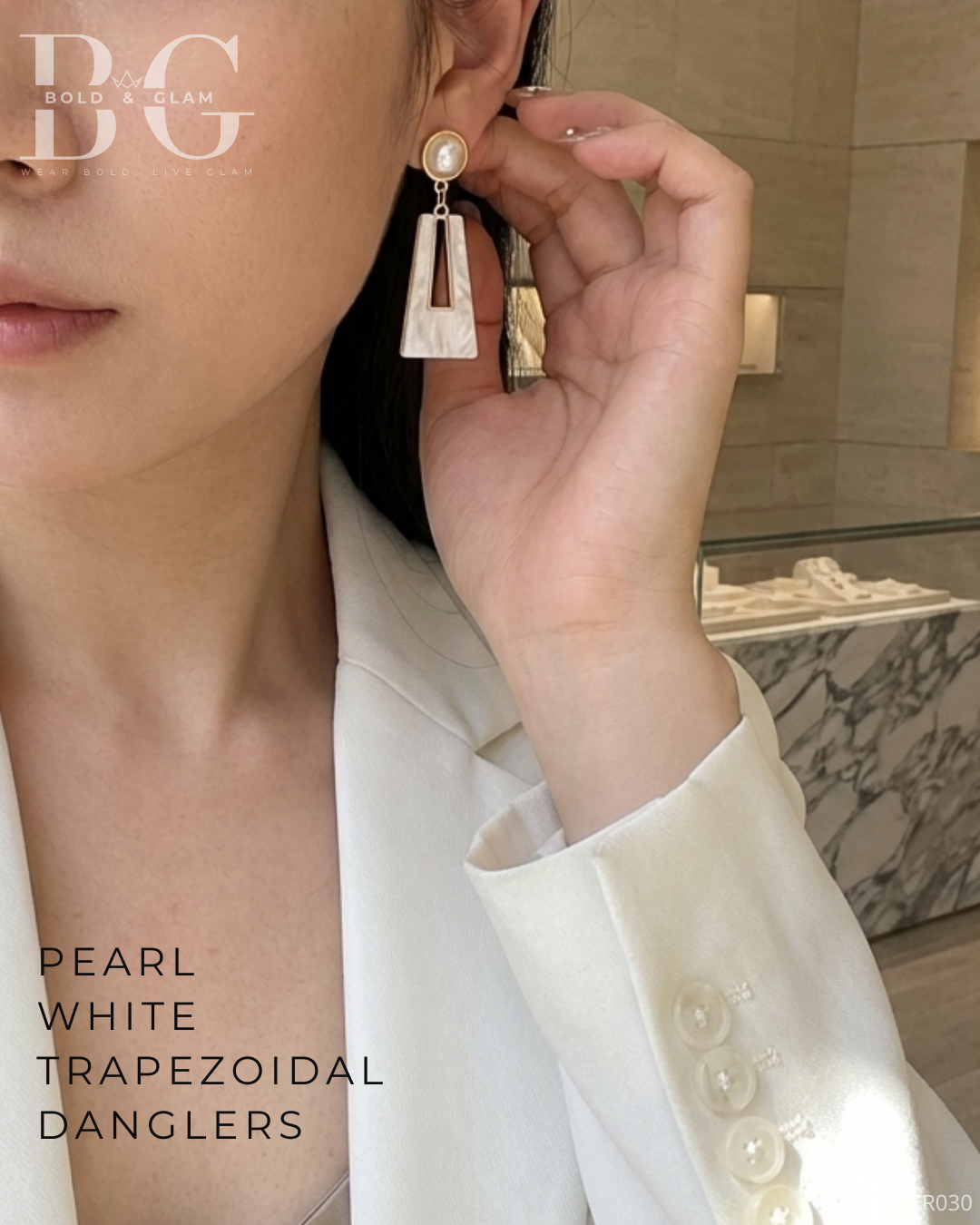 Elevate your look with our Bold Trapezoidal Design Danglers in Pearl White. These eye-catching earrings combine modern geometry with timeless charm, ensuring you stand out effortlessly whether it’s a casual outing or a formal event.